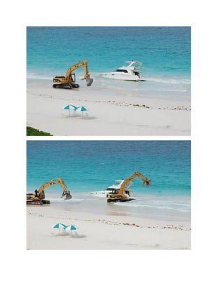 El documento describe cómo sacar un bote de $1,500,000 atascado en un arrecife en las Bahamas. Se necesitaron varios intentos, incluido el uso de grúas y remolcadores, pero finalmente se logró sacar el bote del arrecife y llevarlo a un astillero para reparaciones.