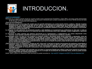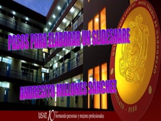Este documento explica cómo crear y administrar una cuenta en Slideshare, una plataforma para compartir presentaciones en línea. Primero se describe brevemente qué es Slideshare y sus beneficios. Luego, se detallan los 7 pasos para crear una cuenta, que incluyen registrarse con nombre, correo y contraseña, llenar el perfil personal, y subir presentaciones en formato PowerPoint. Finalmente, se invita a los lectores a investigar cómo usar esta herramienta en entornos educativos.