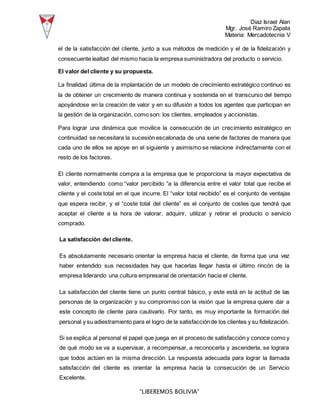 El documento aborda la importancia de satisfacer a los clientes a través de una adecuada gestión de recursos humanos, flexibilidad y experiencias positivas. Se destaca la necesidad de fidelización mediante marketing relacional y la percepción de valor para el cliente como pilares esenciales para el éxito comercial. Además, enfatiza que la satisfacción del cliente es fundamental para la supervivencia de la empresa y debe ser una prioridad en la cultura organizacional.