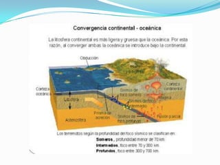 El documento resume cómo se formaron los continentes y océanos a partir de un supercontinente llamado Pangea. Hace aproximadamente 390 millones de años, los continentes de Laurencia, Báltica y Avalonia chocaron entre sí para formar las montañas Apalaches del norte. Actualmente, las placas tectónicas flotan debajo de la superficie de la Tierra, uniéndose y separándose para dar forma a los continentes e intercambiar océanos.