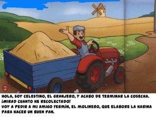 El granjero Celestino ha terminado la cosecha y almacenado el trigo en silos para luego pedirle a su amigo el molinero Fermín que lo muela en harina. Fermín usa un molino de viento para moler el grano entre dos enormes muelas y producir una harina fina, la cual envasa en sacos. La esposa de Celestino, Margarita, toma la harina para amasar el pan, dejarlo leudar y hornearlo en un horno de leña que Celestino construyó, para luego v