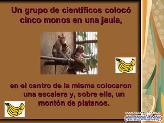 El documento describe un experimento con monos en el que los científicos colocaron una escalera con plátanos y castigaban a los monos que intentaban subir con agua fría. Con el tiempo, los monos aprendieron a evitar la escalera y a golpear a cualquier mono que intentara subir, incluso cuando los científicos sustituyeron a los monos originales. El experimento ilustra cómo los paradigmas y comportamientos se pueden perpetuar aun cuando ya no hay una razón original para ellos.