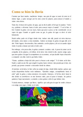 Una gota de agua se cansó de estar en el mismo lugar y le pidió al Sol que la ayudara a elevarse hasta el cielo para conocer el mundo. El Sol la convirtió en vapor de agua y así pudo subir y visitar otros lugares, haciendo amistades con los pájaros. Después de unos días se sintió sola y le pidió al viento que la ayudara a bajar para invitar a otras gotas de agua a acompañarla. Al descender se posó sobre un campo de trigo lleno de gotas de roc