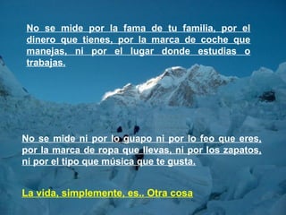 El documento argumenta que la vida no se mide por factores externos como con quién sales, tu fama, dinero o apariencia, sino por cómo tratas a los demás, la felicidad o tristeza que les causas, y si usas la vida para alimentar el corazón de otros de manera positiva o negativa. La vida depende de las decisiones que tomas y cómo afectan a los demás a través de tus acciones, palabras, juicios y trato hacia ellos.
