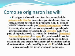 El origen de los wikis se remonta a 1995 cuando Ward Cunningham creó el primer WikiWikiWeb para almacenar patrones de programación. Un wiki es una página web que permite a los usuarios editar, modificar o borrar su contenido de forma interactiva y sencilla. Esto favorece el trabajo colaborativo y democratiza la creación de contenido.