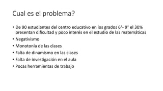 El documento describe un proyecto para mejorar el aprendizaje de matemáticas en grados 6° a 9° mediante el uso de TIC. Actualmente, el 30% de los estudiantes muestran dificultades y falta de interés en matemáticas debido a problemas como monotonía en las clases y falta de herramientas. El objetivo del proyecto es integrar software y aplicaciones de TIC para dinamizar las clases de matemáticas y mejorar la motivación y participación de los estudiantes a través de herramientas de comunicación sincrónicas y