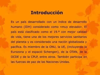 Portugal es un país desarrollado situado en el sudoeste de Europa, en la península ibérica. Limita con España y tiene costas en el océano Atlántico. La capital y ciudad más grande es Lisboa. Portugal tiene una economía estable y un clima suave, y el turismo es una industria importante. La cultura portuguesa incluye el fado, una música melancólica, y vinos y pasteles tradicionales.