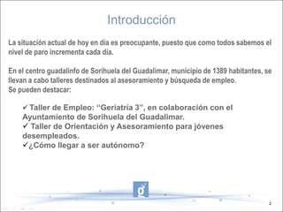 Este documento describe un proyecto realizado en un centro Guadalinfo para asesorar a un ciudadano llamado Juan Carlos en cómo convertirse en trabajador autónomo. El proyecto tuvo como objetivos orientar a nuevos emprendedores, asesorar sobre los pasos administrativos para ser autónomo, y enseñar sobre tecnologías de gestión. Gracias a la formación y asesoramiento recibido, Juan Carlos pudo emprender un negocio de transporte de mercancías y convertirse en autónomo.