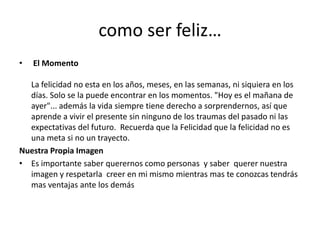 Para ser feliz, es importante vivir el presente sin los traumas del pasado ni las expectativas del futuro. También es clave aceptarse a uno mismo y querer nuestra propia imagen. Aunque muchos piensan que necesitan mucho para ser felices, la felicidad a menudo está justo delante. Es importante saber perdonar para liberarse de la culpa y poder ser feliz, y ser menos crítico de uno mismo y de los demás. Finalmente, la felicidad depende más de apreciar las cosas sencillas de la vida que de las emociones superficiales, y de