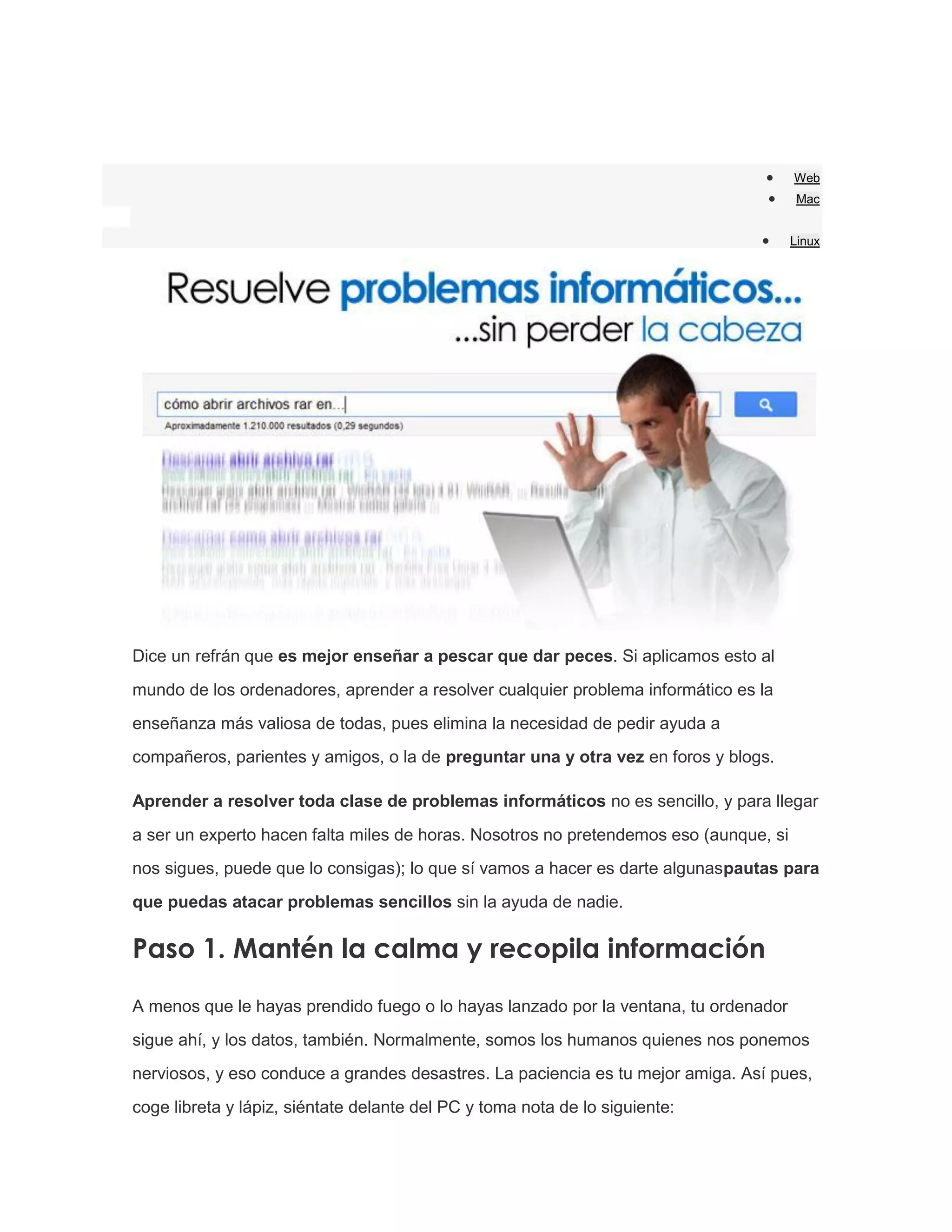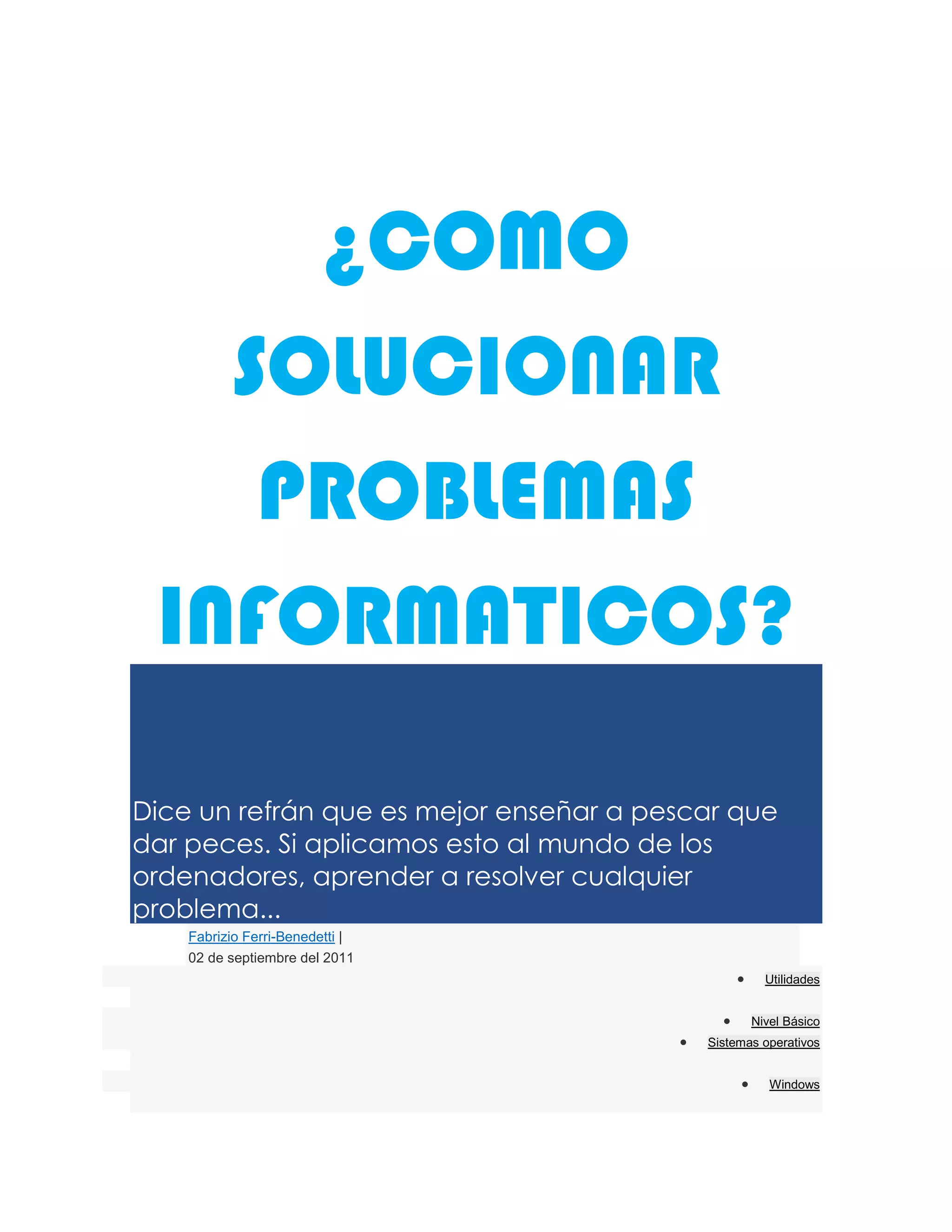 Este documento ofrece consejos para resolver problemas informáticos de forma independiente. Recomienda mantener la calma y recopilar información sobre el problema. Luego sugiere buscar soluciones en Google de manera enfocada y experimentar con las opciones del sistema operativo sin miedo. También aconseja preguntar en redes sociales y, como último recurso, utilizar una máquina del tiempo para deshacer cambios recientes. El objetivo es enseñar a resolver problemas por uno mismo en lugar de depender de otros.