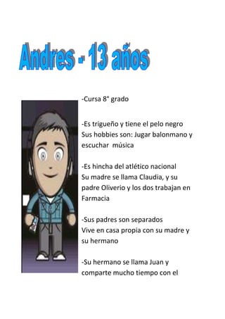 -359410208280-Cursa 8° grado<br/>-Es trigueño y tiene el pelo negro<br />Sus hobbies son: Jugar balonmano y escuchar música<br />-Es hincha del atlético nacional<br />Su madre se llama Claudia, y su padre Oliverio y los dos trabajan en<br />Farmacia<br />-Sus padres son separados<br />Vive en casa propia con su madre y su hermano<br />-Su hermano se llama Juan y comparte mucho tiempo con el<br />