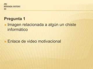Este documento contiene las respuestas a 6 preguntas sobre cómo subir y eliminar presentaciones en SlideShare y Scribd. Se explica cómo subir una presentación a cada sitio, cómo reemplazar una presentación existente en SlideShare, cómo eliminar una presentación de cada sitio, y se proveen enlaces motivacionales.