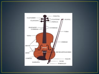 El documento describe los orígenes, partes y técnicas básicas para tocar el violín. Explica que el violín surgió en Italia en el siglo XVI y evolucionó a partir de otros instrumentos como la fídula y la lira da braccio. Detalla las partes del violín y técnicas como el pizzicato, tremolo y vibrato. Además, proporciona 11 pasos para aprender a tocar el violín que incluyen afinar el instrumento, agarrar el arco correctamente y practicar escalas y canciones