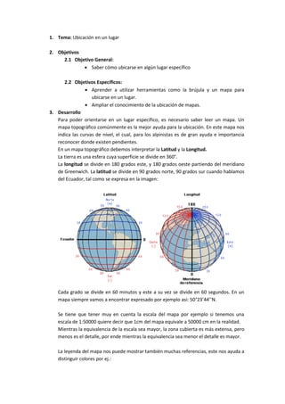 Este documento describe cómo utilizar una brújula y un mapa para ubicarse en un lugar. Explica que un mapa topográfico muestra características como curvas de nivel que indican pendientes, y cómo interpretar coordenadas de latitud y longitud. También describe cómo usar una brújula para determinar una dirección, punto visible u posición actual en un mapa.