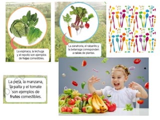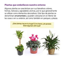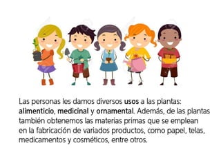 Este documento resume los diferentes usos de las plantas para los seres humanos, incluyendo que nos proveen oxígeno y alimentos, nos ayudan a sanar, y son importantes para nuestra vida. También pide a los estudiantes que respondan preguntas sobre las partes de las plantas, sus usos, cómo cuidarlas, y por qué son importantes.