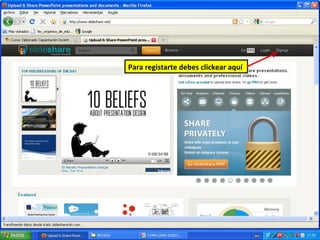 Este documento proporciona instrucciones sobre cómo subir una presentación de PowerPoint a SlideShare y luego incrustarla en una página de Moodle. Explica los pasos para registrarse en SlideShare, subir una presentación, copiar el código HTML, pegarlo en una página de Moodle y guardar los cambios para que los estudiantes puedan ver la presentación.