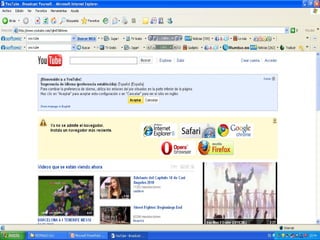 El documento explica cómo usar YouTube, desde la creación de una cuenta hasta la subida de videos. Se detallan los pasos para registrarse, subir un video y cómo establecer su visibilidad como pública o privada. También se menciona brevemente cómo descargar videos utilizando un programa específico.