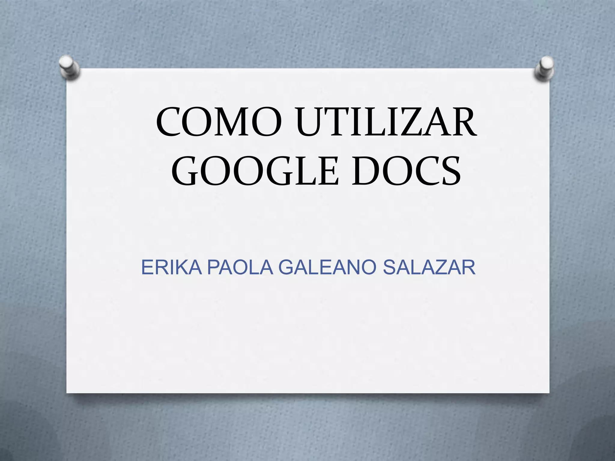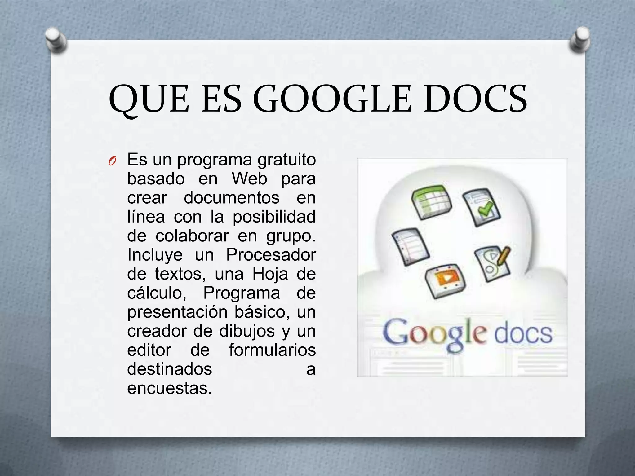 Este documento explica cómo usar Google Docs, un programa gratuito en línea para crear documentos, hojas de cálculo y presentaciones. Describe que Google Docs se puede acceder a través de una cuenta de Gmail, y que permite crear nuevos documentos, compartir archivos con otros, y editar documentos desde cualquier lugar.