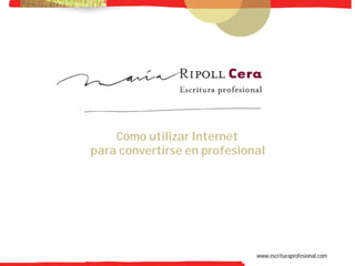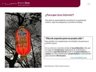 Este documento describe cómo usar Internet para convertirse en un profesional autónomo. Aconseja crear una identidad digital a través de redes sociales y blogs para darse a conocer, buscar oportunidades de trabajo, y mantenerse actualizado. También recomienda participar en eventos y proyectos en línea para ampliar la red profesional y las posibilidades laborales. El objetivo final es aprovechar las herramientas de Internet para desarrollar una carrera profesional flexible y autogestionada.
