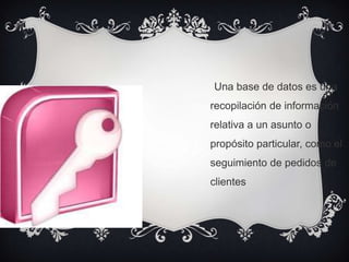 Este documento explica cómo crear y utilizar una base de datos en Access. Primero, se describe cómo crear una nueva base de datos vacía mediante la selección de "Base de datos en blanco" y asignarle un nombre y ubicación. Luego, se explican varias funciones como ordenar registros, aplicar filtros, y usar filtros por formulario para establecer condiciones de filtrado más complejas. Finalmente, se brinda información sobre el uso del carácter comodín en consultas y búsquedas.