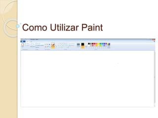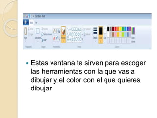Paint proporciona herramientas para dibujar, seleccionar colores y modificar el tamaño de líneas y de la imagen; también permite guardar el documento en formato JPEG u otro formato, o guardarlo con un nombre diferente.