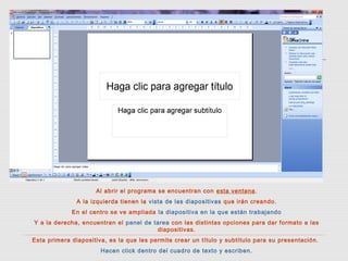 Este documento ofrece una guía básica para crear presentaciones en PowerPoint. Explica cómo abrir el programa y ver las diferentes vistas, e indica que la primera diapositiva se usa para agregar un título y subtítulo. Luego describe cómo insertar nuevas diapositivas en blanco y agregar texto y imágenes utilizando las opciones en el menú Insertar. También cubre cómo aplicar formatos de texto y estilos de diapositiva de forma uniforme.