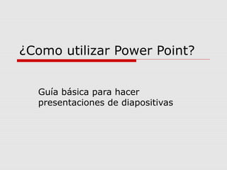 Este documento ofrece una guía básica para crear presentaciones en Power Point. Explica cómo abrir el programa y ver las diferentes vistas y paneles. Detalla cómo agregar diapositivas, texto, imágenes y formato, así como ideas para organizar la presentación de manera efectiva con apoyo visual y una idea por diapositiva. También recomienda explorar más opciones como videos, efectos de animación y tiempo de transición entre diapositivas.