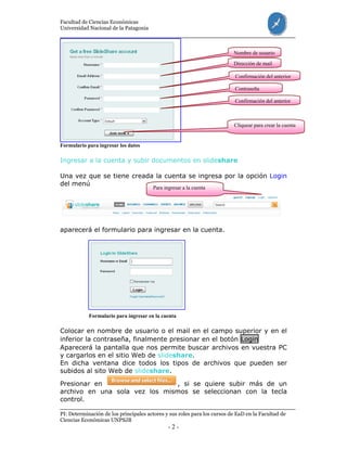 Slideshare es un sitio web que permite compartir presentaciones, documentos y archivos. Para subir documentos a slideshare, se requiere crear una cuenta gratuita e ingresar título, tags, descripción y privacidad del documento. Una vez subido, el documento puede insertarse en Moodle copiando el código embed de slideshare y pegándolo en un bloque HTML.