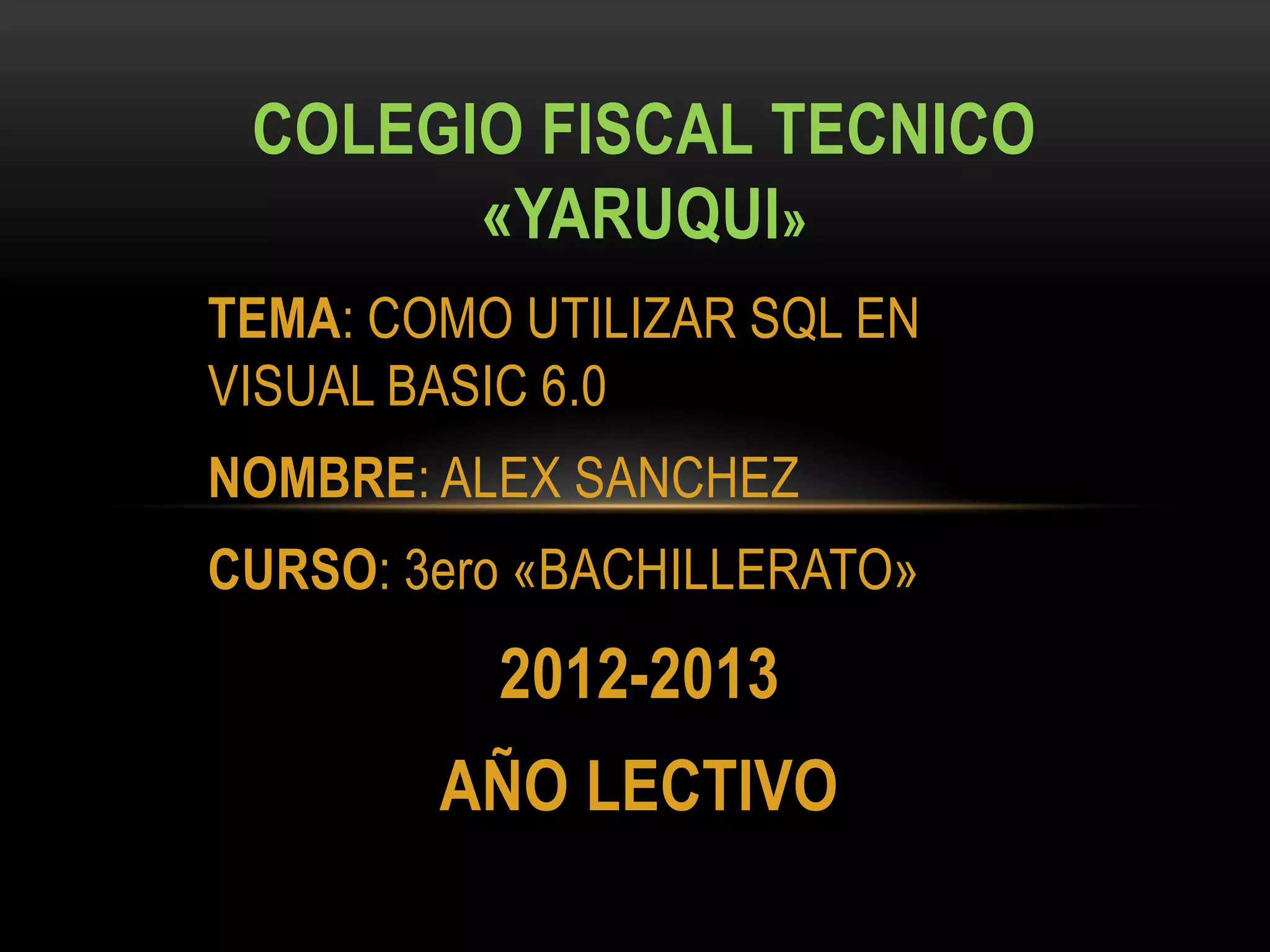 1. El documento explica cómo utilizar SQL en Visual Basic 6.0, describiendo SQL como un lenguaje orientado a bases de datos para realizar consultas de manera sencilla.