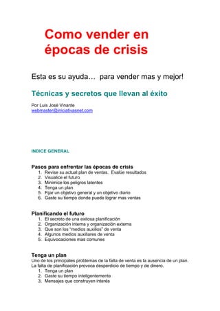Este documento ofrece consejos para vender en épocas de crisis. Recomienda revisar el plan de ventas actual y evaluar los resultados. También sugiere visualizar el futuro, minimizar riesgos, tener un plan con objetivos generales y diarios claros, y gastar el tiempo en clientes con mayor potencial de ventas. Finalmente, destaca la importancia de la planificación con objetivos claros, compromiso, revisión constante y reducción de distracciones para enfrentar con éxito los tiempos de crisis.