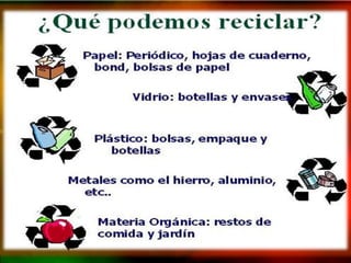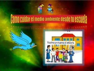 El documento proporciona consejos para vivir de manera más sostenible y cuidar el medio ambiente, como apagar las luces innecesarias, usar menos agua, reciclar y reutilizar materiales, plantar árboles y limpiar espacios públicos. También recomienda extender estas prácticas al ámbito escolar organizando campañas de cuidado del agua, sembrando más árboles y manteniendo limpias las aulas y las instalaciones escolares. Finalmente, explica cómo separar la basura en orgánica e in