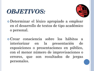 Este documento presenta diferentes tipos de expresiones lingüísticas a evitar en textos académicos y presentaciones, como comodines, muletillas y frases recargadas. Define cada tipo y proporciona ejemplos. También explica los verbos predicativos y ofrece recursos en línea sobre estos temas. El objetivo es determinar el léxico apropiado y crear conciencia sobre hábitos que pueden resultar en errores al expresarse.