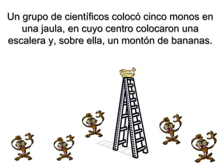 Este documento describe un experimento con monos donde los científicos sustituyeron progresivamente a todos los monos originales. A pesar de que los monos sustitutos nunca recibieron un castigo de agua fría, continuaron golpeando a cualquier mono que intentara subir la escalera para alcanzar las bananas, perpetuando así el comportamiento que aprendieron de los monos originales. El documento sugiere que a menudo continuamos comportamientos establecidos sin cuestionar el por qué, similar a lo que ocurrió con los monos en el experimento.
