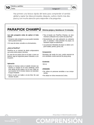 Este folleto explica cómo usar un champú antipiojos llamado ParaPiox. Indica que el champú mata piojos y liendres en 10-15 minutos cuando se aplica masajeando el cuero cabelludo y dejándolo actuar antes de enjuagar. Recomienda no compartir peines u otros objetos personales para evitar contagios, y que una sola aplicación usualmente es suficiente aunque se puede repetir al cabo de 7 días si persisten los piojos.