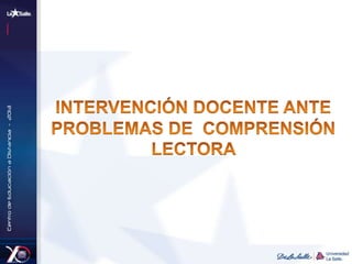 El documento presenta información sobre factores que afectan la comprensión lectora y estrategias para mejorarla. Describe barreras individuales, ambientales y pedagógicas para la comprensión lectora y sugiere crear un ambiente que motive la lectura y enseñar estrategias como lectura en voz alta y guiada. El objetivo es que los estudiantes vayan más allá de la comprensión literal usando diferentes técnicas.