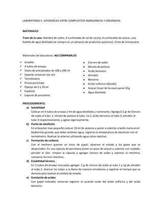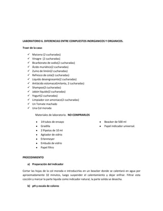 Este documento presenta los procedimientos de dos laboratorios sobre las diferencias entre compuestos inorgánicos y orgánicos. El Laboratorio 5 incluye pruebas de solubilidad, punto de ebullición, formación de carbono, estabilidad térmica y constante de acidez de varios compuestos. El Laboratorio 6 implica medir el pH y el color de indicador de diferentes sustancias comunes usando una escala de colores. El Laboratorio 7 describe cómo obtener óxidos, ácidos y bases a través del tratamiento térmico de metales y no