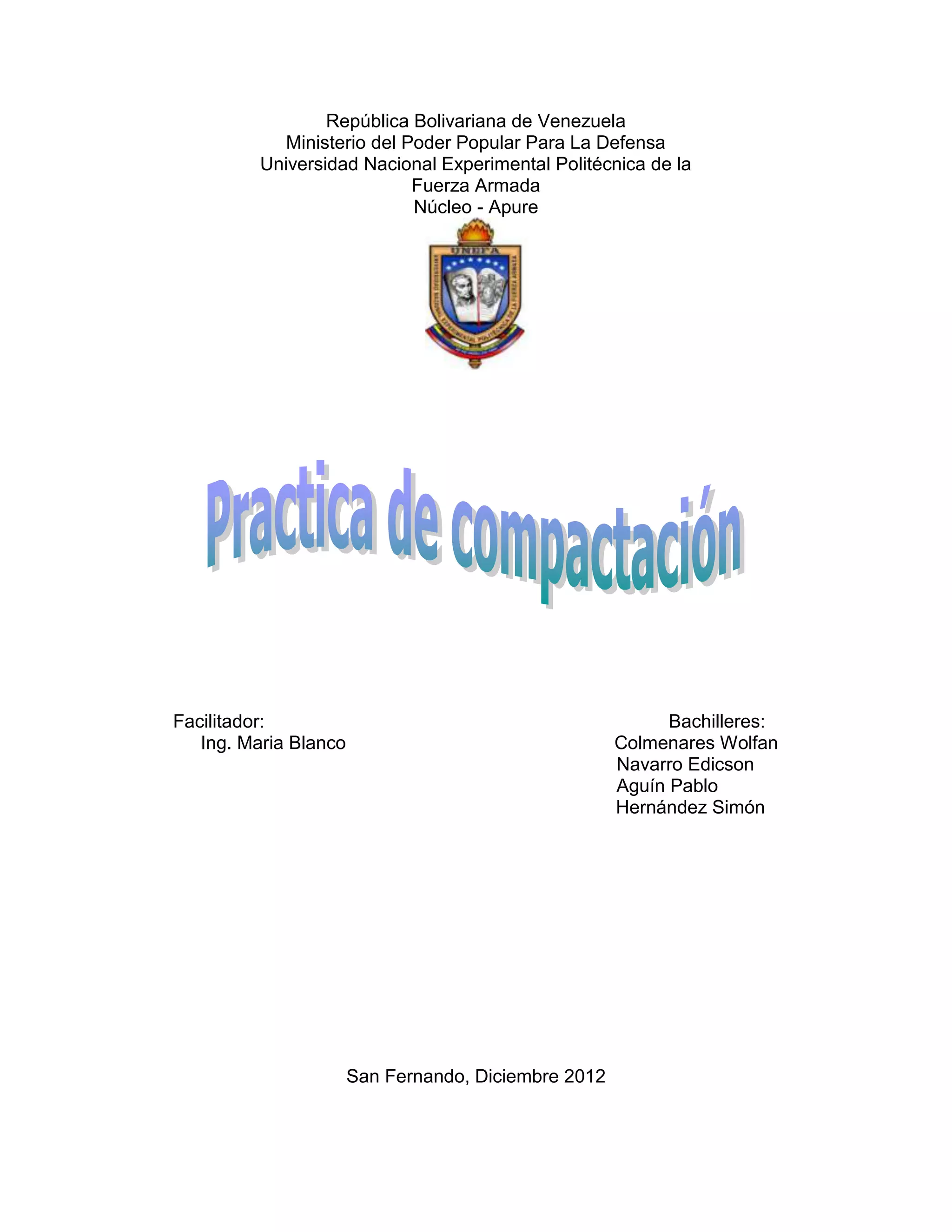 Este documento describe los pasos realizados en un laboratorio para determinar la densidad máxima y humedad óptima de una muestra de suelo arcilloso mediante un ensayo de compactación Proctor. La muestra se seca, tamiza y pesa antes de agregar diferentes cantidades de agua y compactarla en capas en un molde cilíndrico. Luego se calcula la densidad húmeda para cada contenido de humedad y se grafican los resultados para identificar la densidad máxima y humedad óptima del suelo. El objetivo