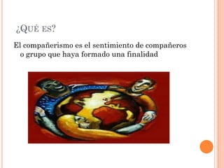 El documento define el compañerismo como el sentimiento de pertenencia a un grupo con un propósito común. Explica que existen dos tipos de compañerismo, el bueno que implica ayudar a otros sin esperar nada a cambio, y el malo que perjudica a terceros. Además, señala que el compañerismo se basa en el respeto mutuo, la buena convivencia y la ayuda ocasional entre compañeros. Finalmente, destaca que el trabajo en equipo requiere comprenderse unos a otros, apoyar ideas que benefic