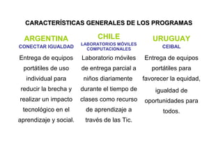 Los tres programas presentados (Conectar Igualdad en Argentina, Enlaces en Chile y Ceibal en Uruguay) tienen como objetivo reducir la brecha digital y mejorar el acceso a la educación a través de la entrega de equipos portátiles a estudiantes y docentes. Si bien cada país tiene sus propias características de financiamiento y destinatarios, los tres programas comparten el enfoque de utilizar las tecnologías de la información para solucionar problemas de aprendizaje y brindar una educación acorde a las demandas actuales.