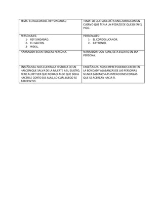 Este documento contiene dos historias breves. La primera historia trata sobre un halcón que salva a su dueño el Rey Sindabad de la muerte, pero luego el Rey le corta las alas al halcón por no hacer algo que solía hacer, de lo que luego se arrepiente. La segunda historia trata sobre una zorra y un cuervo, donde la zorra intenta engañar al cuervo para robarle un pedazo de queso. La enseñanza de ambas historias es que no siempre podemos confiar en la bondad y alabanzas de