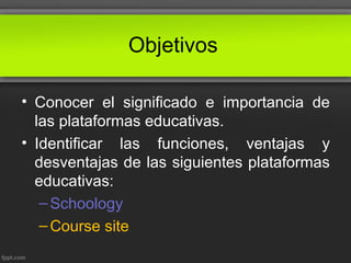 El documento compara dos plataformas educativas: Schoology y Course Site. Ambas son plataformas gratuitas en la nube que permiten a profesores crear cursos online, publicar material, evaluar estudiantes y comunicarse. Schoology se describe como una red social educativa sencilla de usar, mientras que Course Site utiliza la tecnología de Blackboard y permite evaluar el rendimiento de los estudiantes.