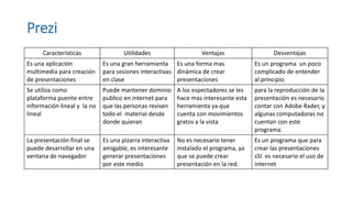 PowerPoint, Prezi y SlideShare son herramientas para crear presentaciones. PowerPoint permite crear presentaciones con plantillas e inserción de medios. Prezi es una aplicación interactiva no lineal para sesiones dinámicas. SlideShare almacena diapositivas en línea para compartir y ver presentaciones desde cualquier dispositivo. Cada herramienta tiene ventajas y desventajas dependiendo del propósito, dejando al usuario decidir cuál es la más adecuada.