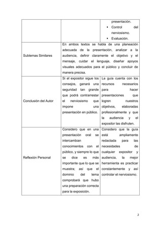 El documento presenta dos guías sobre cómo hacer presentaciones orales. Ambas guías discuten elementos clave como la recopilación de información, la estructura de la presentación, la comunicación verbal y no verbal, y cómo controlar los nervios. También enfatizan la importancia de una planeación adecuada, analizar a la audiencia, y definir claramente el objetivo y mensaje.