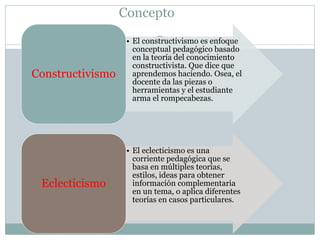 El documento compara el constructivismo y el eclecticismo. El constructivismo ve al estudiante como constructor de su propio conocimiento, mientras que el eclecticismo se basa en múltiples teorías. Ambos enfoques difieren en su visión del estudiante, el docente, el aprendizaje y el ambiente. Figuras claves del constructivismo son Piaget y Vygotsky, mientras que Gagné es relevante para el eclecticismo.