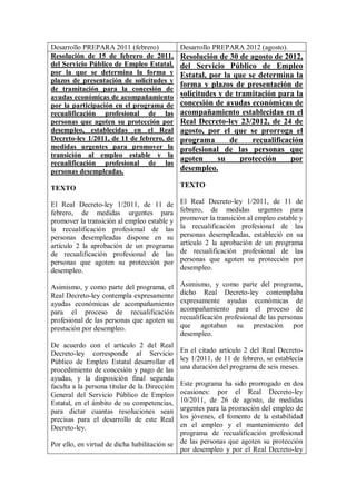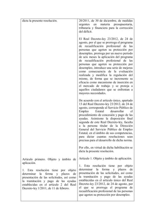 Este documento establece las resoluciones de 2011 y 2012 sobre el programa de recualificación profesional de personas desempleadas que agotan su protección por desempleo (PREPARA). Define los requisitos para ser beneficiario de las ayudas económicas de acompañamiento, el régimen de concesión y compatibilidad de las ayudas, y determina los plazos y forma de presentación de solicitudes.