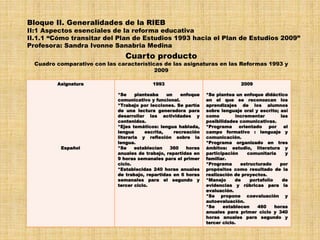 El documento presenta un cuadro comparativo de las características de las asignaturas en las reformas educativas de 1993 y 2009 en México. Se describen los enfoques, organización de contenidos, horas de trabajo, competencias desarrolladas y otros aspectos clave de cada asignatura como Español, Matemáticas, Ciencias Naturales, Geografía, Historia, Formación Cívica y Ética, Educación Física y Educación Artística en ambas reformas.