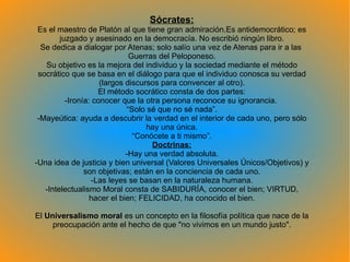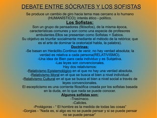 Los sofistas eran filósofos itinerantes que enseñaban retórica con el objetivo de triunfar socialmente. Sostenían doctrinas relativistas donde no hay verdad absoluta sino que depende del individuo. Sócrates se oponía a los sofistas y creía en una verdad y leyes universales basadas en la naturaleza humana. Usaba el método socrático del diálogo y la mayéutica para ayudar a los demás a descubrir su verdad interior.