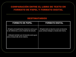 El documento compara el libro de texto en formato de papel y formato digital, analizando sus destinatarios, contexto de uso, finalidades, contenido, actividades y ventajas. Explica que el formato digital permite mayor interactividad y recursos multimedia, mientras que el papel es más accesible y sirve de guía para el docente. Finalmente, recomienda utilizar el libro en papel en el aula escolar, complementado con el digital de forma opcional y solo en el contexto escolar.
