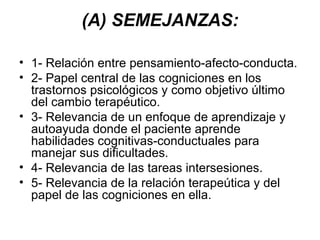 Este documento compara la terapia cognitiva conductual (TC) y la terapia racional emotiva (TRE). Ambas comparten el énfasis en la relación entre pensamientos, afectos y conducta, y el papel de las cogniciones en los trastornos psicológicos. Sin embargo, difieren en que la TRE se centra rápidamente en las creencias disfuncionales, mientras que la TC primero trabaja las distorsiones cognitivas para identificar las creencias subyacentes. Otra diferencia es que la TRE utiliza el debate racional