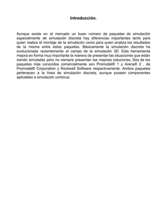 El documento compara los programas de simulación Promodel y Arena en el contexto de un trabajo académico. Se detallan diferencias clave en su funcionamiento, visualización y manejo de errores, destacando que Arena facilita la visualización y ajuste de modelos, mientras que Promodel tiene desafíos en ese aspecto. Ambos pertenecen a la simulación discreta, pero ofrecen características distintas que impactan en el proceso de modelado y análisis.